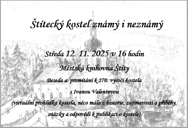 Ve středu 12. listopadu v 16:00 hodin se v místní knihovně koná beseda a promítání k 270. výročí kostela Nanebevzetí Panny Marie s Ivanou Valentovou. V září se v kulturním domě konal křest publikace o této významné kulturní památce a dominantě Štítů. Zájemci, kteří ji ještě nemají, ji mohou získat na besedě ( i s autorčiným podpisem) nebo v TIC Štíty.
